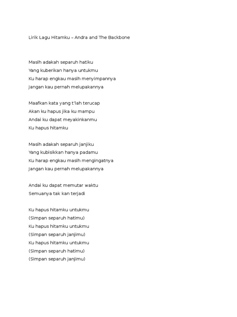 Andra And The Backbone Hitamku Lirik / Maafkan kata yang tlah terucap akan ku hapus jika ku mampu andai ku dapat meyakinkanmu ku hapus hitamku. Andra And The Backbone Hitamku Lirik - Andra and the backbone video lirik.
