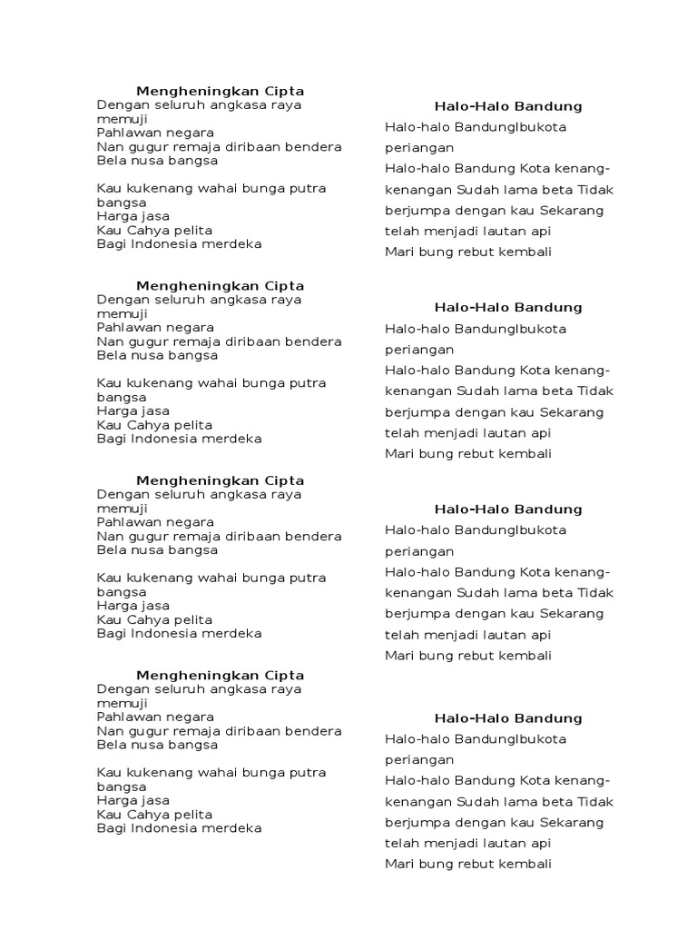 Doc Lirik Lagu Wajib Just Nurman Academia Edu - Dengan seluruh angkasa raya memuji pahlawan negara nan gugur remaja diribaan bendera bela nusa bangsa kau kukenang wahai bunga putra bangsa harga jasa kau cahya pelita bagi indonesia merdeka.