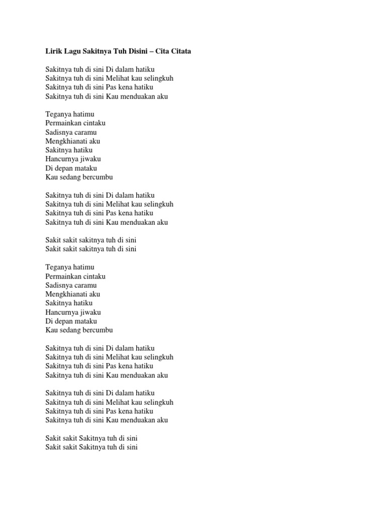 Sakitnya Hatiku Lirik : Sakitnya tuh disini…di dalam hatiku sakitnya tuh disini.melihat kau selingkuh sakitnya tuh disini…pas kena hatiku sakitnya tuh disini…kau. Sakitnya Hatiku Lirik - Video lirik dari via vallen berjudul 'sakit sakit hatiku'.